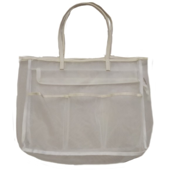 Bolsa grande transparente. Ela tem uma alça de ombro, o fechamento é a zíper e vem com três compartimentos frontais.