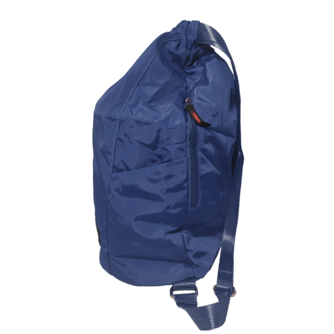 Mochila saco luxuosa revestida com material impermeável, com um bolso lateral e zíper lateral.