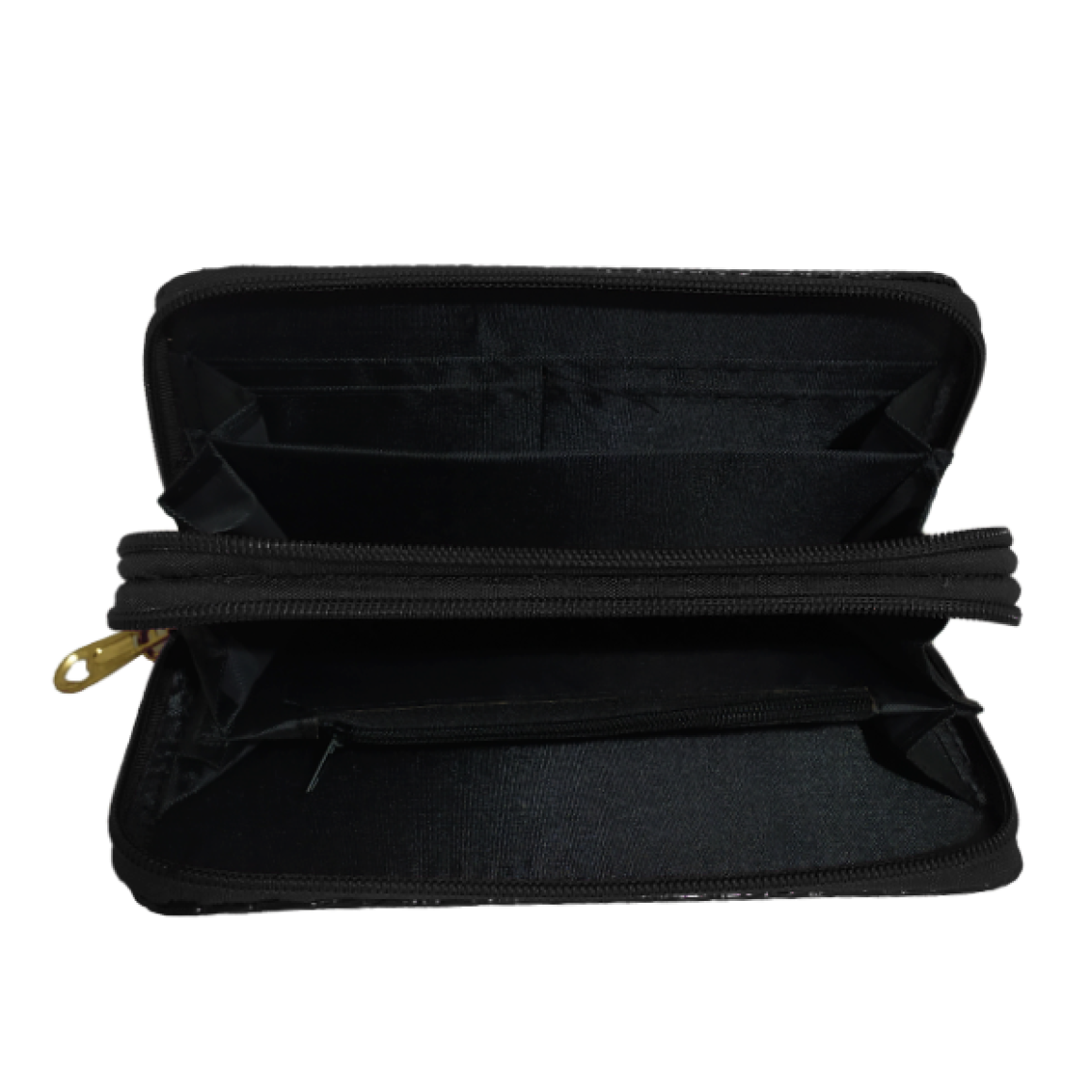 Carteira de verniz com várias divisórias vem com dois zíper e alça comprida para usar como bolsa.