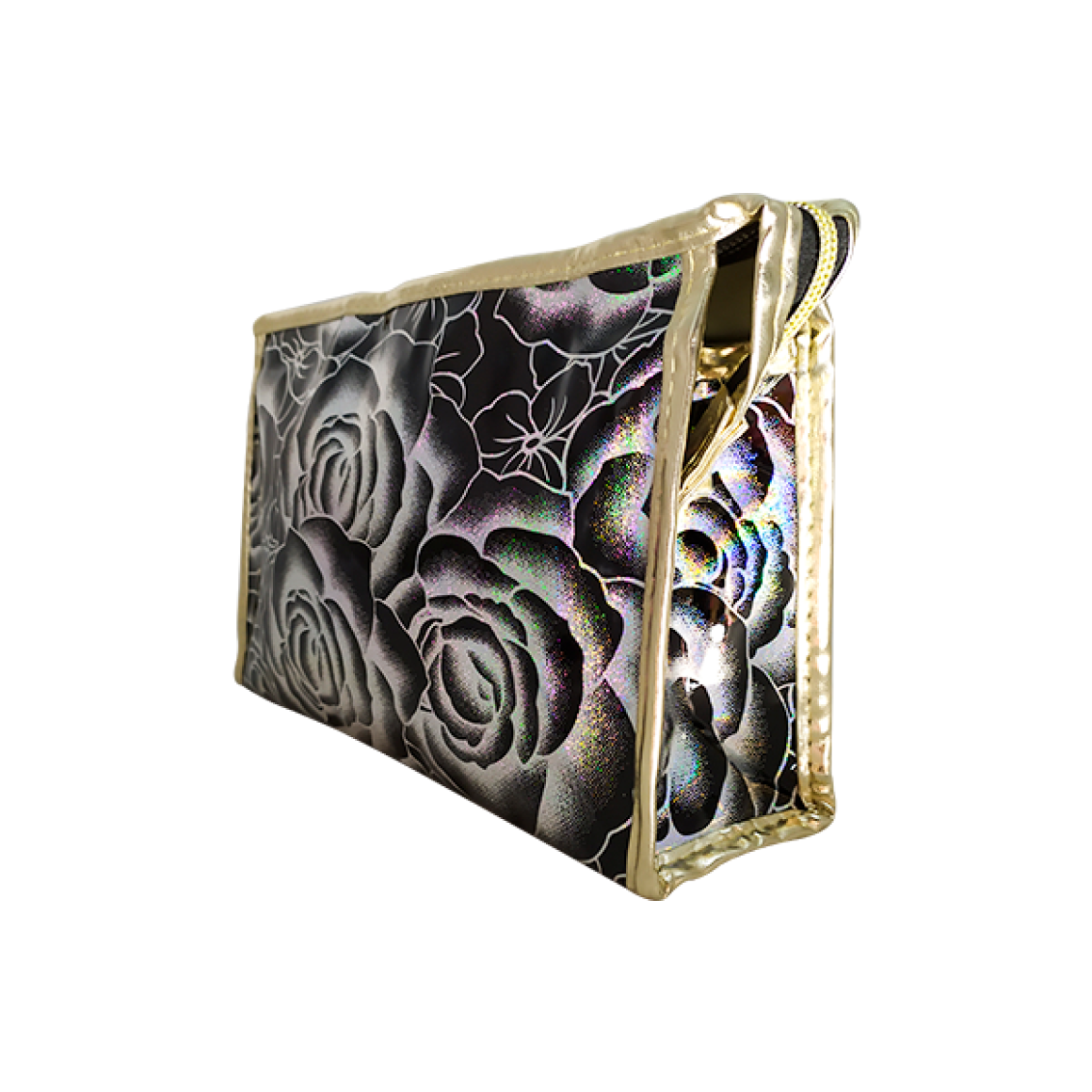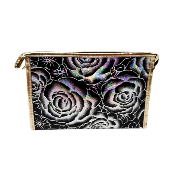 NECESSAIRE DE ROSAS COM BRILHOS HOLOGRÁFICOS